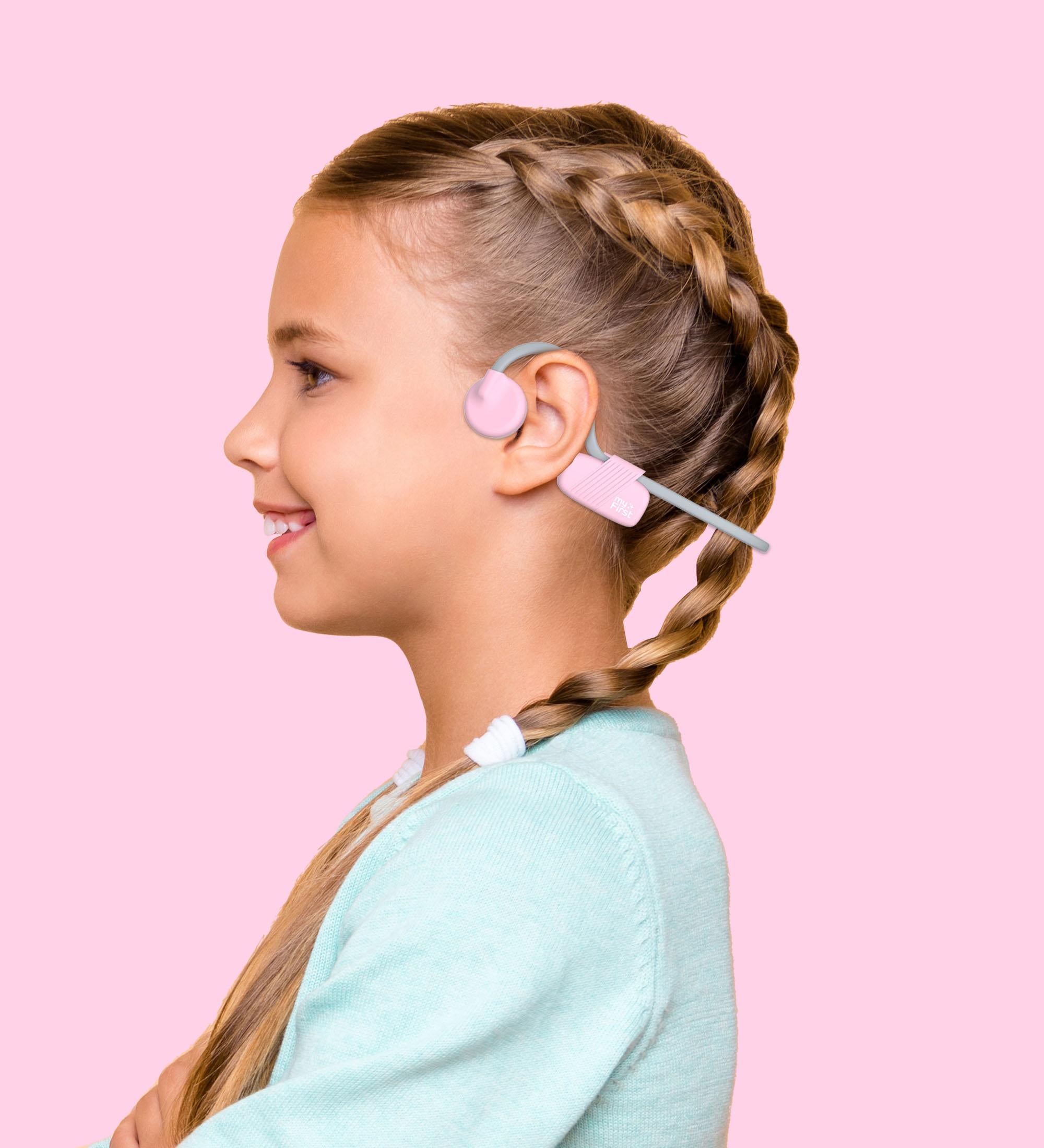 A diferencia de los auriculares tradicionales, BC Wireless lite utiliza la tecnología de conducción ósea para transmitir el sonido a través de los pómulos. Esta tecnología deja los oídos abiertos a los sonidos del entorno. El audio se ajusta a un volumen adecuado, lo que garantiza niveles de escucha seguros para el niño.