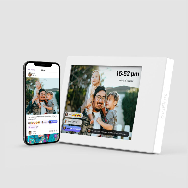 Diseñado para fomentar conexiones más fuertes entre los seres queridos, el Marco se sincroniza perfectamente con otros dispositivos myFirst, mostrando un flujo de contenido compartido por familiares y amigos.