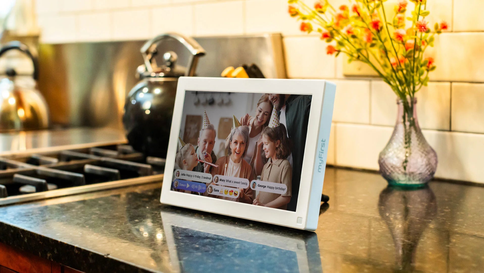 Diseñado para fomentar conexiones más fuertes entre los seres queridos, el marco se sincroniza perfectamente con otros dispositivos myFirst, mostrando un flujo de contenido compartido por familiares y amigos.