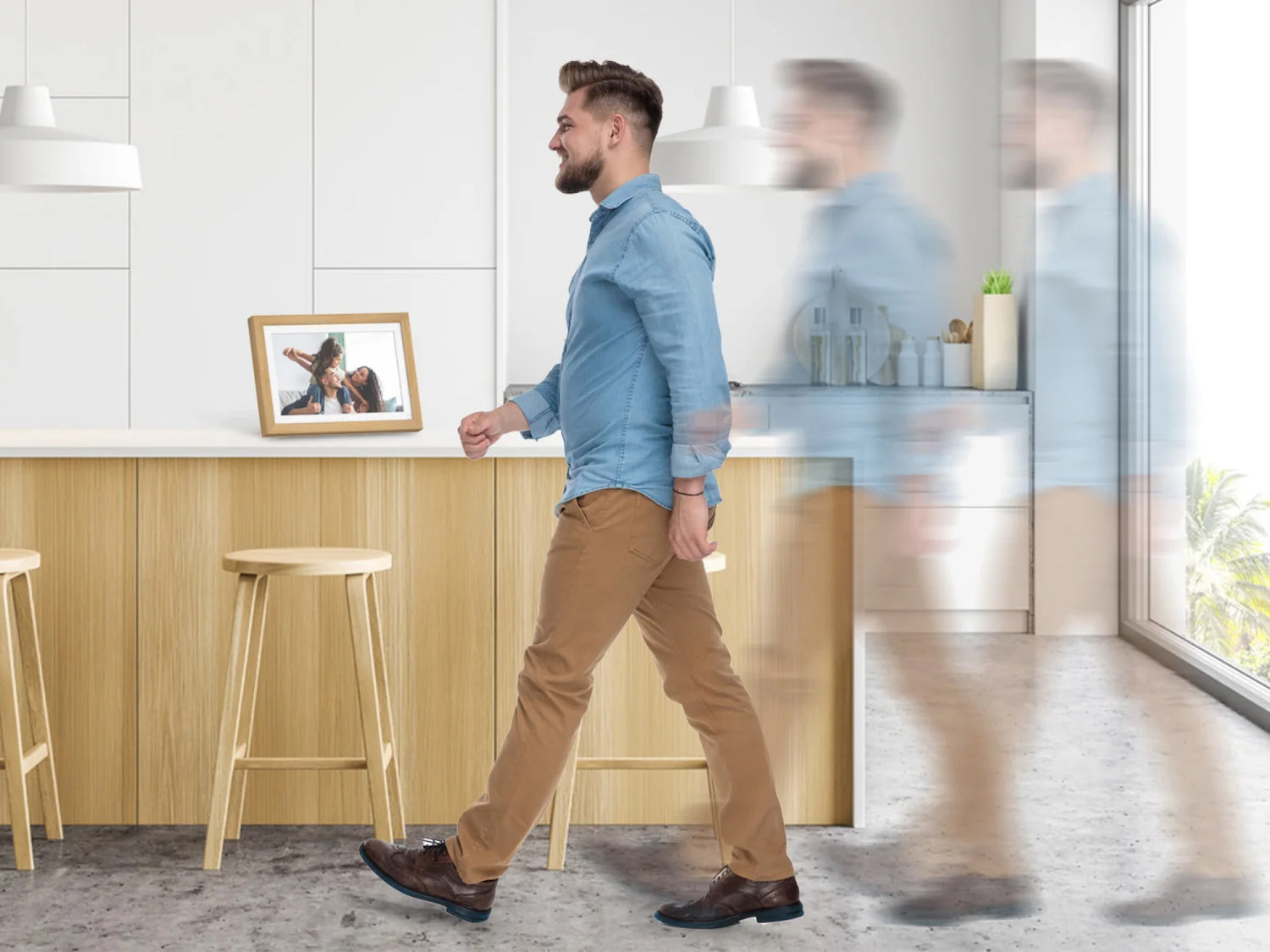 Nuestro diseño ecológico de ahorro de energía apaga automáticamente el dispositivo cuando sales de la habitación, y espera ansioso tu regreso, mostrando nuevos momentos a medida que te acercas.